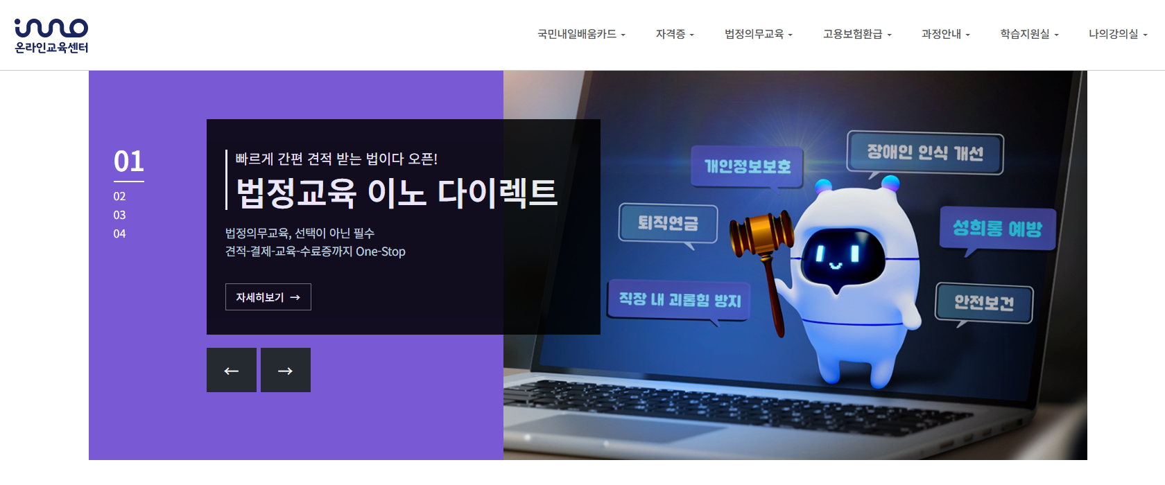 이노솔루션은 산업안전보건교육을 비롯한 다양한 법정의무교육을 온라인으로 제공합니다. 산업안전보건법 제31조에 따른 사업장 내 안전보건교육을 이러닝으로 간편하게 이수할 수 있도록 지원하고 있습니다.