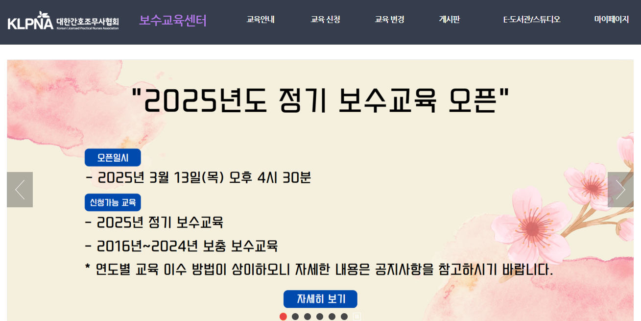 KLPNA 대한간호조무사협회 보수교육센터의 온라인 교육신청 시스템을 통해 간호조무사는 편리하게 법정 보수교육을 이수할 수 있습니다. 정기적인 교육 이수를 통해 전문성을 유지하고 양질의 의료 서비스를 제공하는 간호조무사가 되시길 바랍니다.