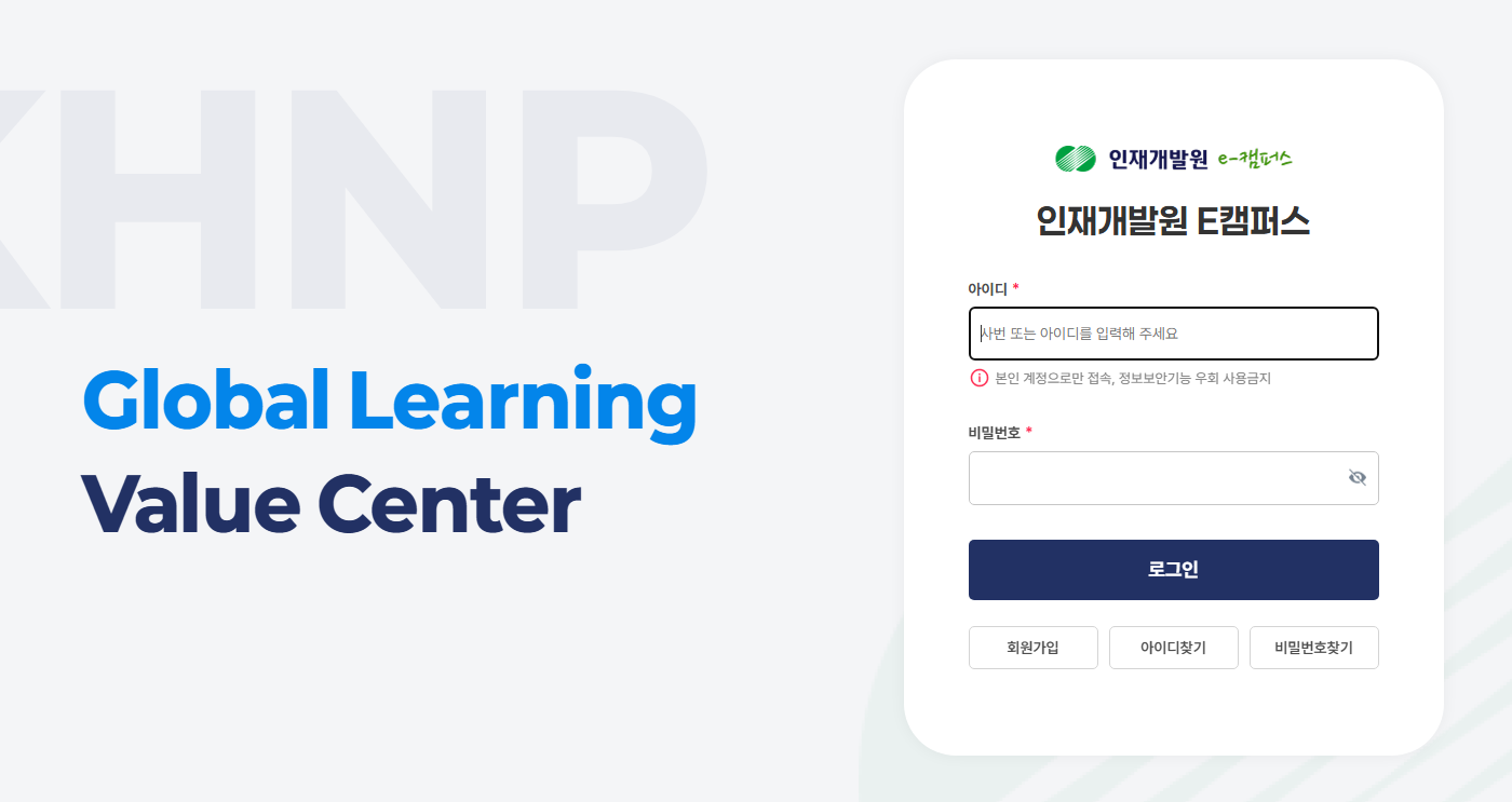 한국수력원자력 인재개발원 e-캠퍼스(www.e-khnp.com)는 2003년부터 운영되어 온 온라인 교육 시스템으로, 매년 수만 명의 임직원이 다양한 교육과정을 수료하고 있습니다. 직무별·분야별로 세분화된 과정과 자기계발, 어학, 인문경영, IT 등 다양한 콘텐츠를 제공하여 임직원들의 역량 강화를 지원합니다.