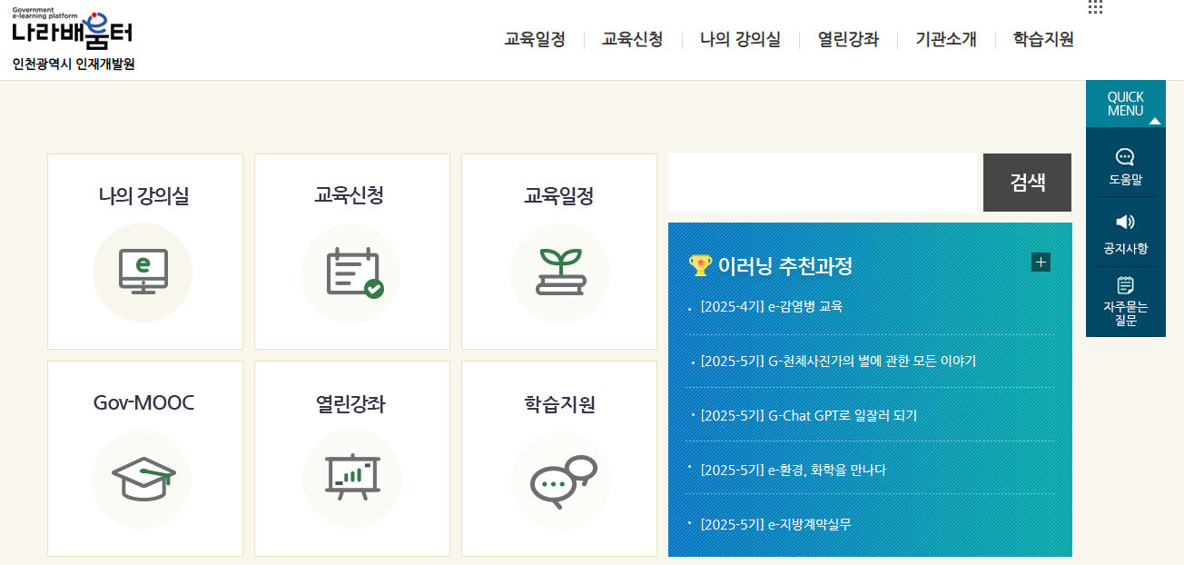 인천광역시 인재개발원 나라배움터는 공공분야 인재들의 역량 강화와 자기계발을 위한 최적의 온라인 학습 플랫폼입니다. 다양한 교육 과정과 편리한 시스템, 체계적인 학습 지원으로 인천시 공무원 및 관련 인재들에게 큰 도움이 되고 있습니다.