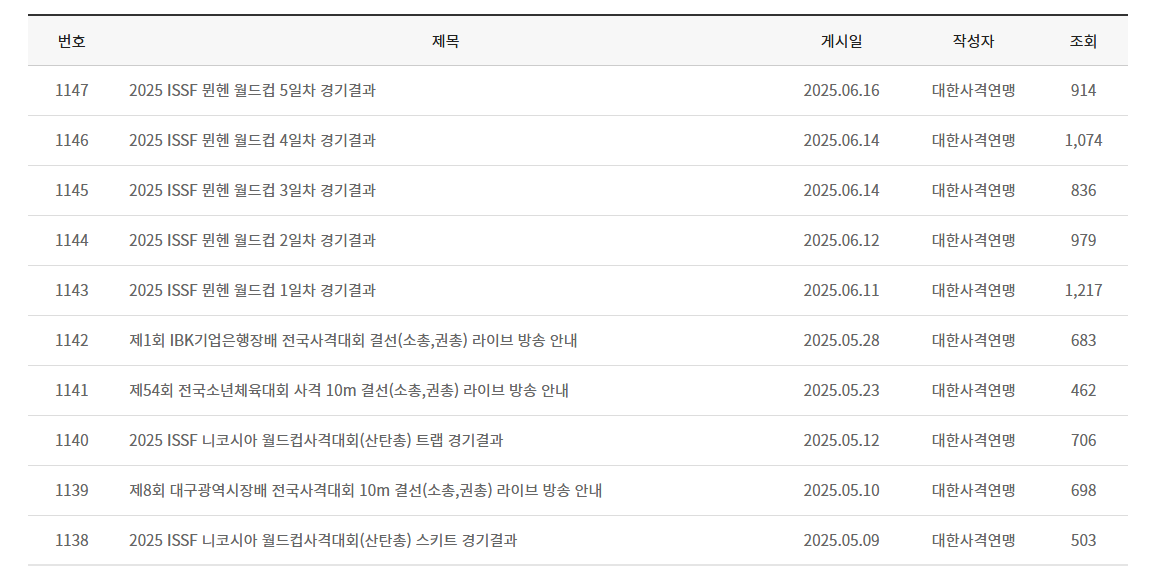 국내외 사격대회 일정, 참가 안내, 경기 결과 등 최신 대회 소식을 신속하게 제공합니다. - 국가대표 선발 및 훈련 안내