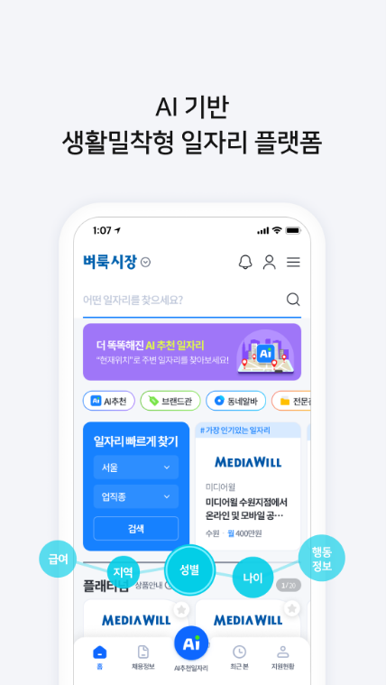 AI 기반으로 똑똑한 추천 시스템을 도입하여 간편하지만 더욱 정확해진 AI 추천일자리를 제공합니다. 지역별, 업종별, 브랜드 일자리, 단기알바 등 딱 맞는 정보만 연결해줍니다.