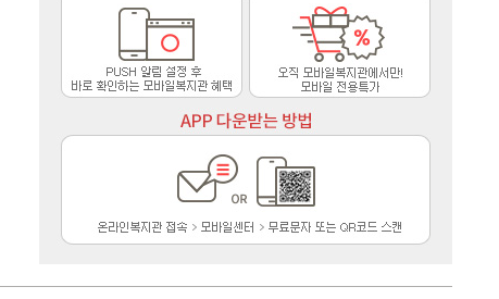 | 어플 다운로드 | 온라인복지관 접속 → 모바일센터 → QR코드 스캔 |