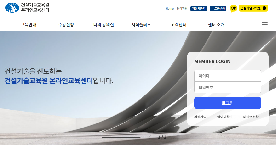건설기술교육원 온라인 교육센터는 건설 분야의 전문 지식과 기술을 온라인으로 학습할 수 있는 플랫폼입니다. 언제 어디서나 접속하여 자신만의 페이스로 학습할 수 있는 환경을 제공하고 있으며, 특히 바쁜 현대인들에게 시간과 장소에 구애받지 않는 학습 방식을 제공합니다.
