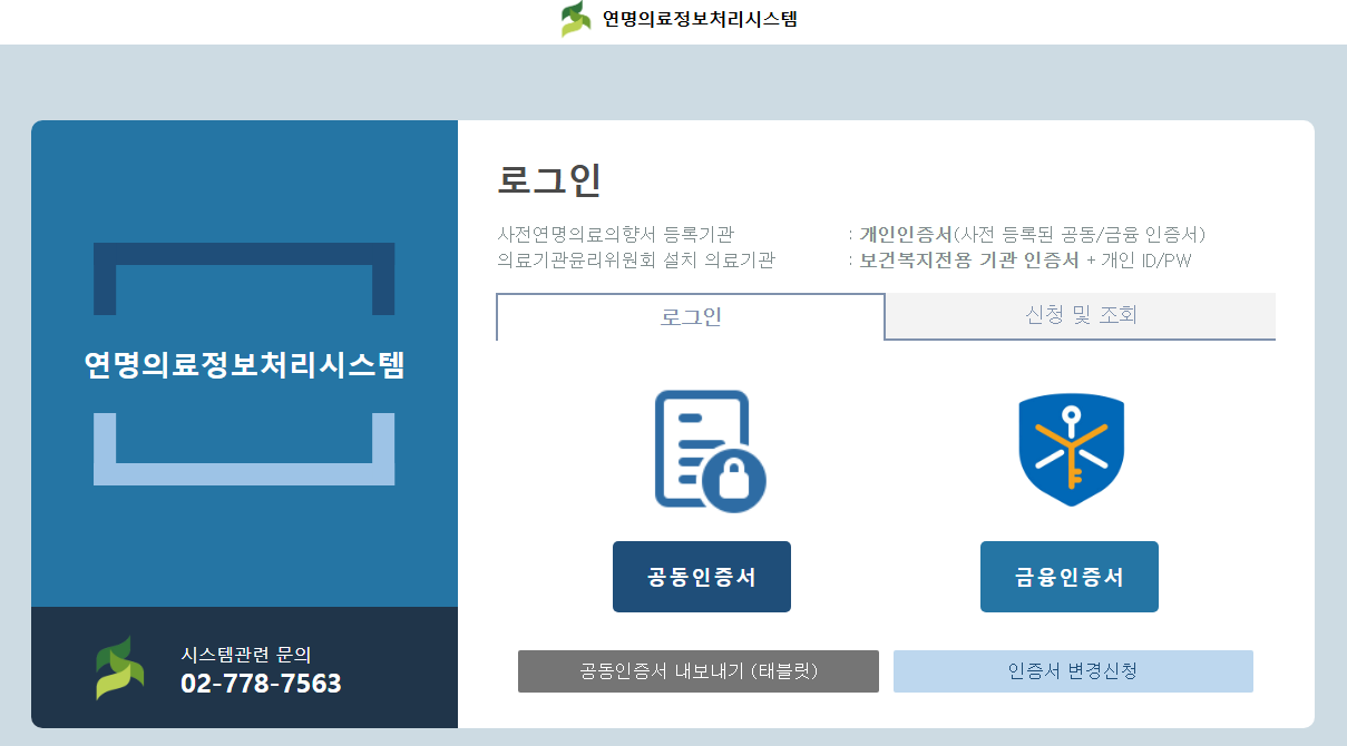 사전연명의료의향서 등록기관의 경우 개인인증서를 사용하여 로그인할 수 있습니다. 이때 사전에 등록된 공동인증서나 금융인증서를 활용해야 합니다.