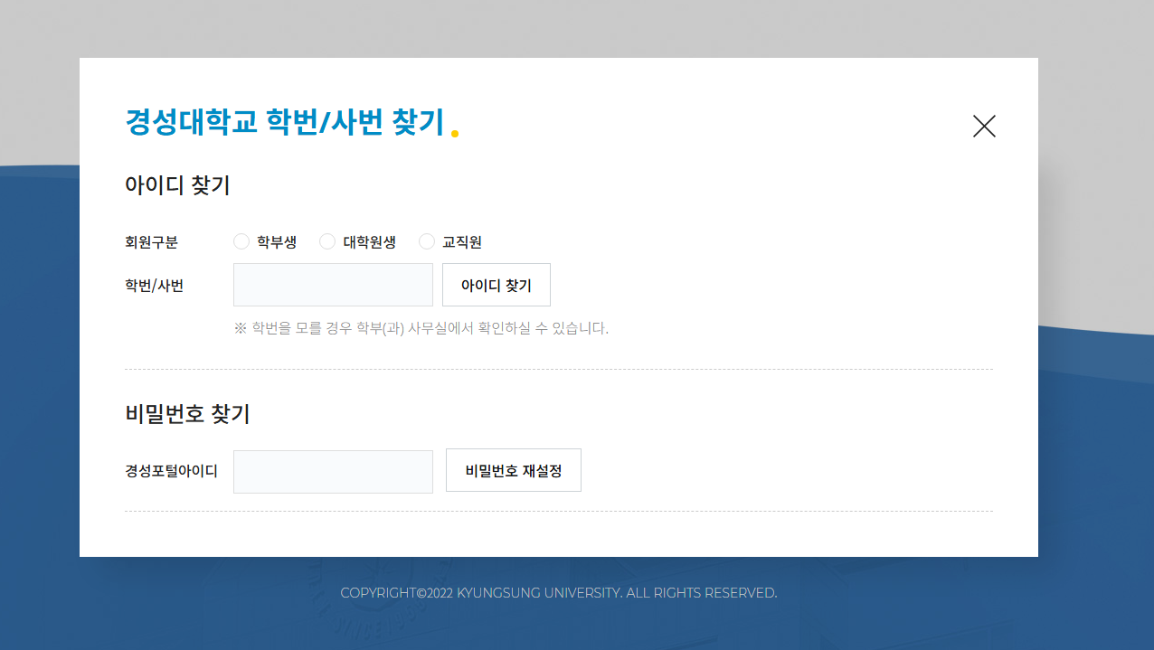 경성포탈 로그인 시 5회 연속 로그인 실패 시 계정이 잠금 상태가 됩니다. 이 경우 비밀번호 찾기 기능을 이용하여 비밀번호를 변경하면 잠금 상태가 해제됩니다.