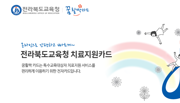 꿈활짝카드는 전라북도교육청이 선정한 병·의원, 심리상담센터 등 110여개 가맹점에서 특수교육대상 학생이 치료지원 전자카드를 사용할 경우, 전라북도교육청에서 가맹점에게 결제대금을 정산하는 바우처카드입니다.