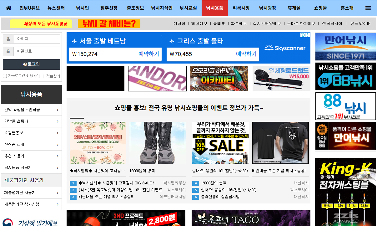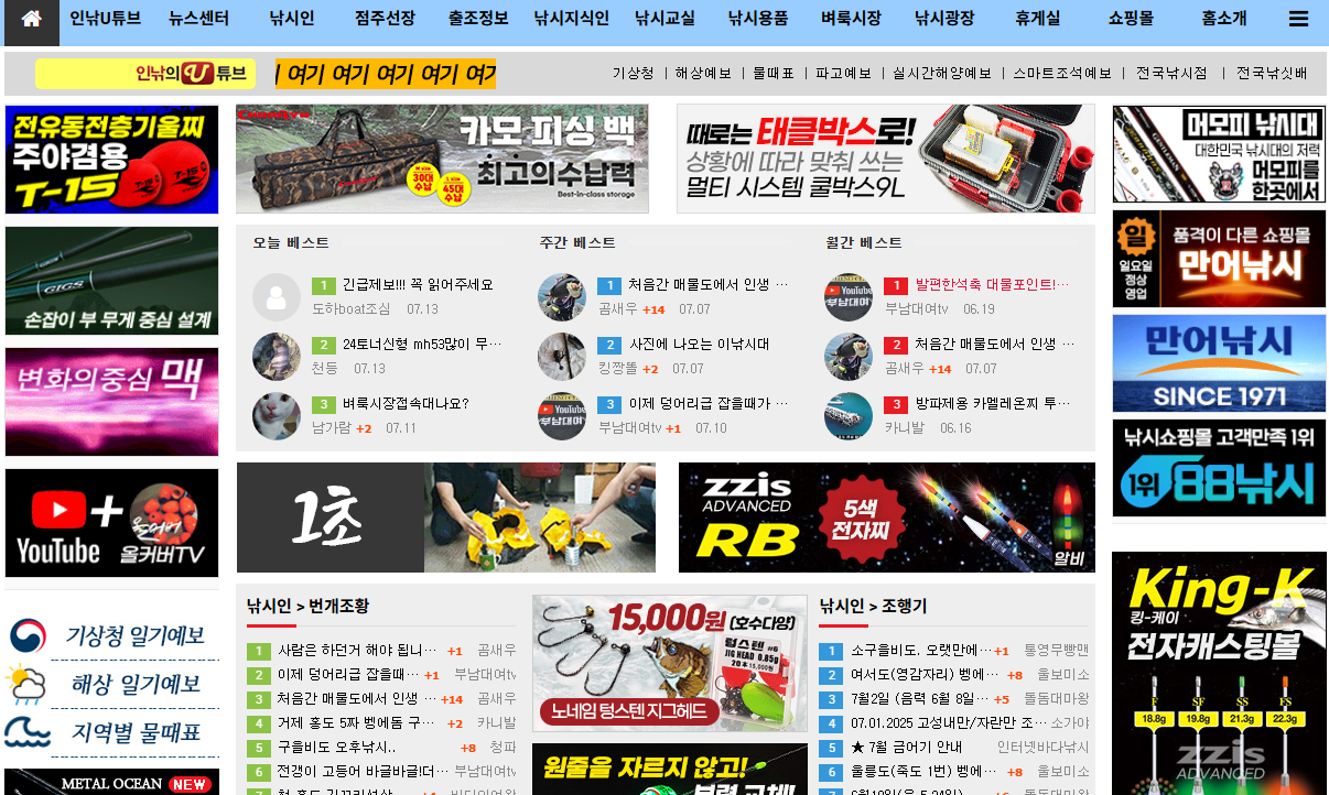 인낚 사이트는 낚시용품 관련 종합 서비스도 제공합니다. 신상품 정보부터 중고 낚시용품 거래까지 가능하며, 벼룩시장 게시판을 통해 개인 간 거래도 활발히 이루어집니다.
