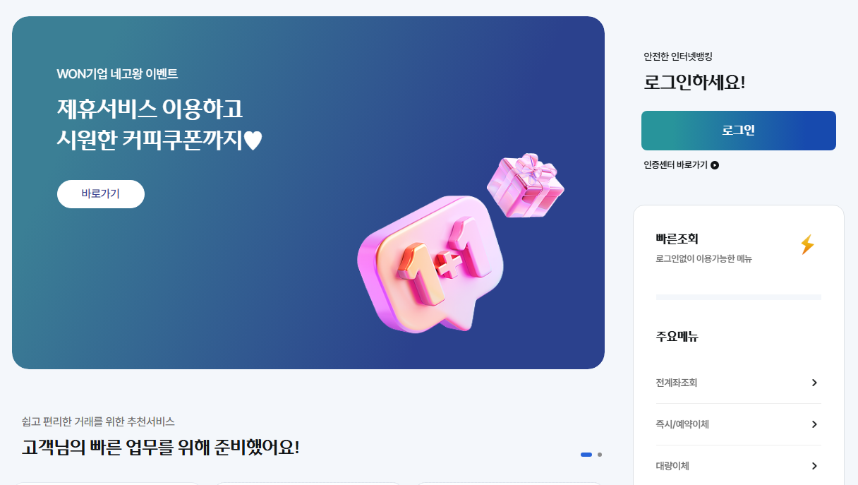 기업의 뱅킹 업무도 영업점 방문없이 편리하게 '우리WON뱅킹 기업'으로 시작하세요. 우리은행 기업인터넷뱅킹 바로가기