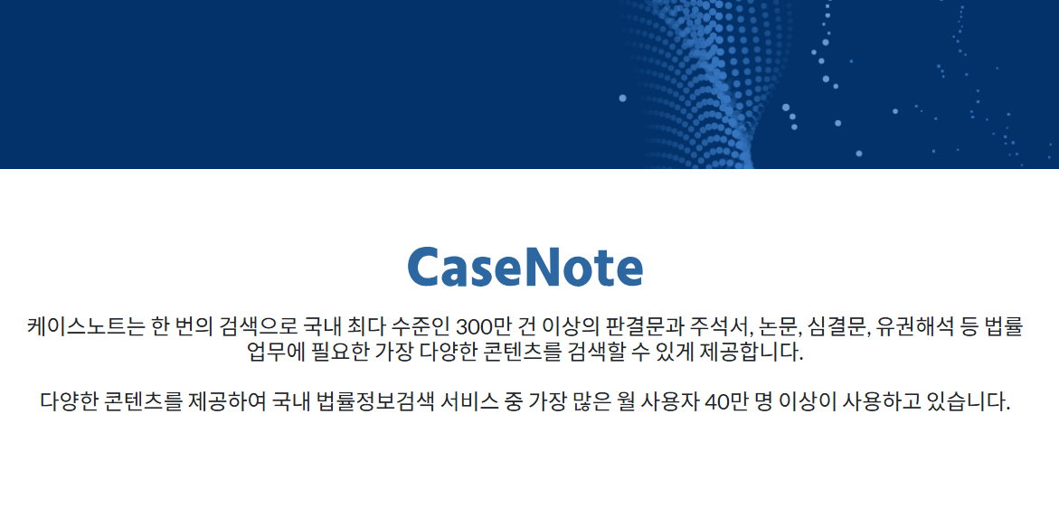 로앤비는 국내 대표적인 유료 법률정보 서비스입니다. 방대한 종합법률정보를 보유하고 있으며, 판례뿐만 아니라 법령, 심판·결정·해석, 문헌, 기업법무 자료 등 다양한 법률 콘텐츠를 제공합니다. 주요 판례에 대한 전문가 평석과 주석서, 법률사전 등의 부가 서비스도 이용할 수 있어 깊이 있는 법률 연구에 적합합니다.