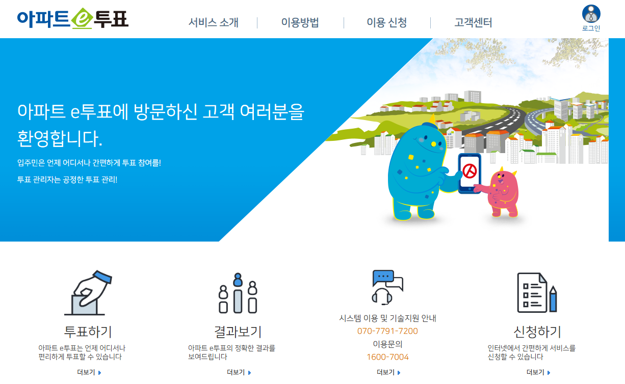 아파트e투표 홈페이지는 체계적인 고객 지원 체계를 운영하고 있습니다. 시스템 이용 및 기술지원은 070-7791-7200번으로, 일반 이용문의는 1600-7004번으로 연락할 수 있습니다.