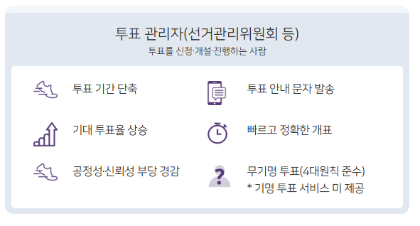 - 투명성: 공정하고 투명한 투표 및 개표 과정 제공