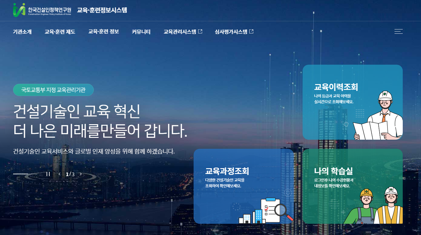 건설기술인의 전문성 향상과 체계적인 교육 관리를 위해 도입된 건설기술인 교육·훈련정보시스템은 국토교통부 지정 교육관리기관인 한국건설정책연구원에서 운영하는 통합 플랫폼입니다. 이 시스템은 건설기술인들이 법정 직무교육을 효율적으로 이수하고 관리할 수 있도록 지원하며, 교육 서비스의 질 향상을 통해 건설산업 전반의 기술 역량 강화에 기여하고 있습니다.