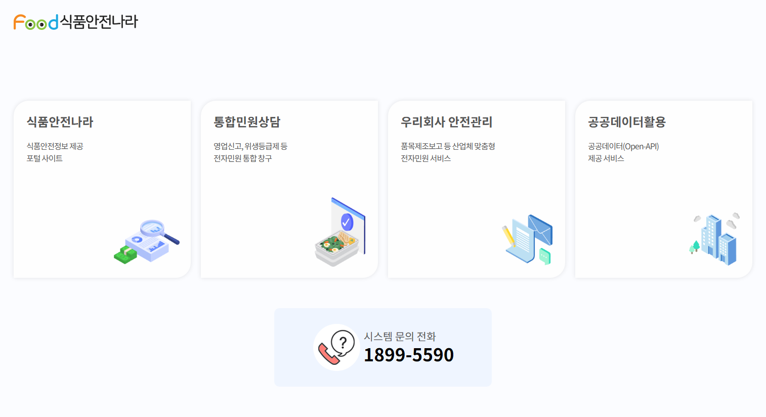 식품안전나라(www.foodsafetykorea.go.kr)는 식품의약품안전처에서 운영하는 식품안전정보 통합 포털입니다. 기존의 식품안전정보포털을 전면 개편하여 2017년 1월 23일부터 서비스를 시작했으며, 식약처의 대표 사이트로 쉽게 인식할 수 있도록 사용자와 식품분야 전문가들의 의견을 반영하여 구축되었습니다.