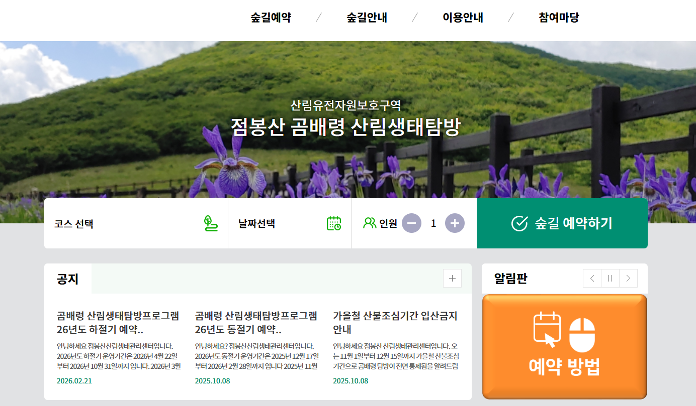 봄철 야생화 시즌(5~6월)과 단풍 시즌(10월)은 예약 경쟁이 매우 치열해 평일에도 당일 예약이 불가능할 정도입니다. 예약 오픈 시각인 매주 수요일 오전 9시에 맞춰 접속하는 것이 중요합니다.