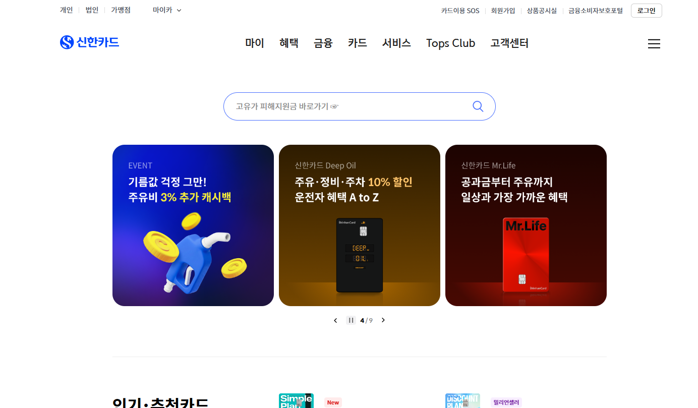 신한카드 공식 홈페이지는 카드 이용과 관련된 모든 서비스를 통합 제공하는 금융 플랫폼입니다. 국내 최대 규모의 카드사답게 월 방문 고객이 1,200만 명에 달하며, 로그인 하나로 대부분의 금융 업무를 비대면으로 처리할 수 있습니다.