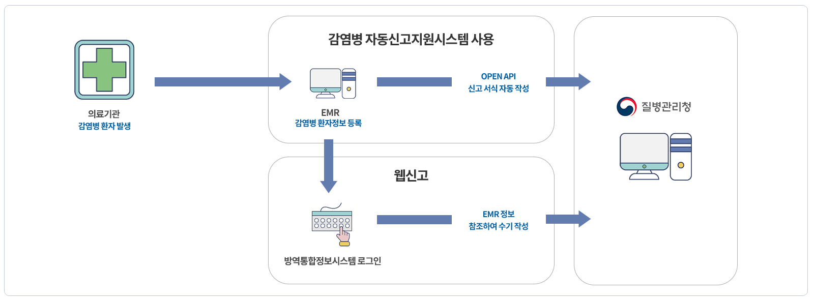 - 감염병 발생 및 사망 신고: EMR 시스템에서 입력된 환자 정보를 기반으로 자동으로 신고서를 생성하여 제출합니다.
