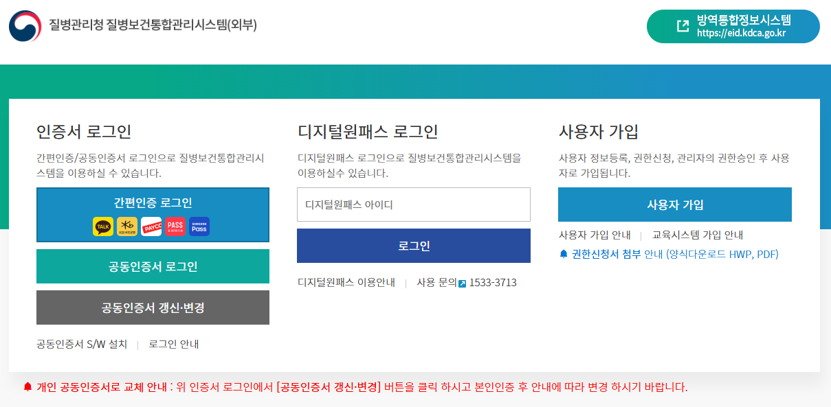 2024년 1월 2일부터 통합관리시스템은 '방역통합정보시스템'으로 전환되어 접속 주소가 변경되었습니다. 기존 주소인 https://is.kdca.go.kr은 https://eid.kdca.go.kr로 변경되었으므로, 이용 시 참고하시기 바랍니다.