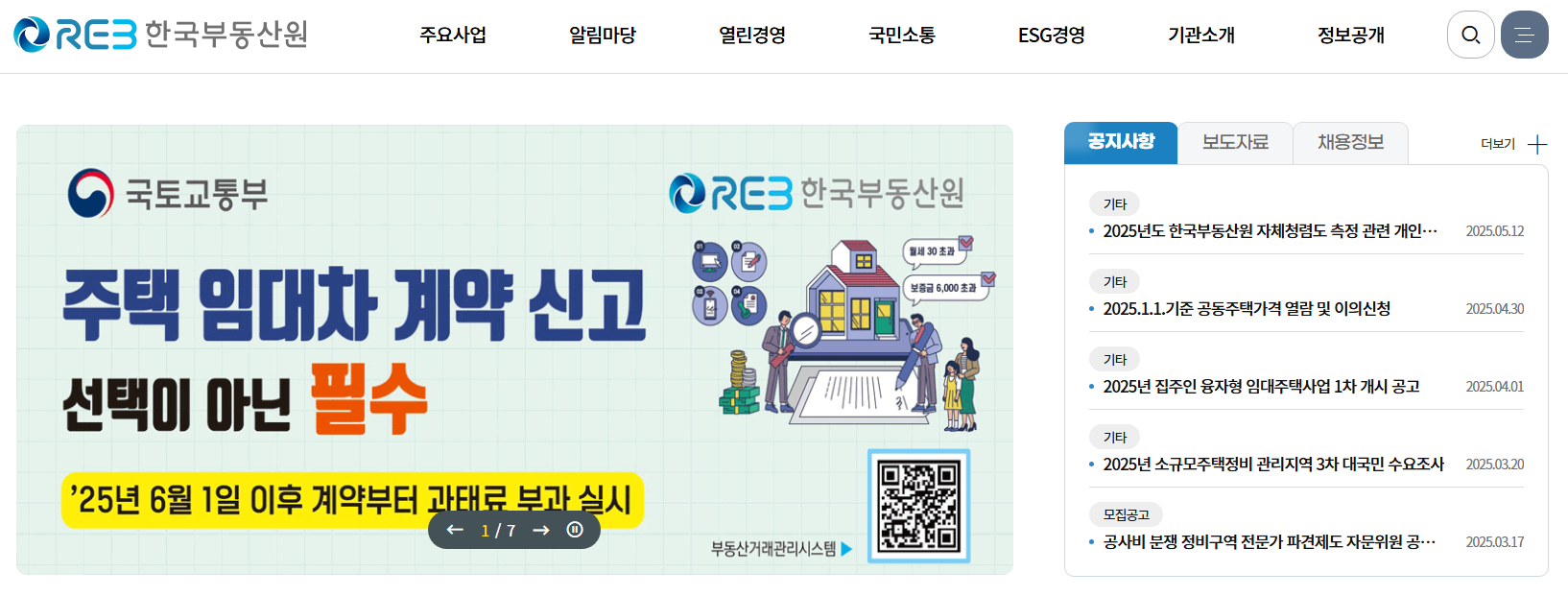 한국부동산원 홈페이지 부동산 가격공시, 조사·통계, 시장관리 등 포괄적인 부동산 서비스를 운영하고 있습니다. 공동주택가격 공시전담, 단독주택가격 공시전담, 토지가격 공시총괄 업무를 통해 정확한 부동산 가격 정보를 제공하며, 전국주택가격동향조사와 지가변동률조사 등을 통해 시장 동향을 파악할 수 있습니다.